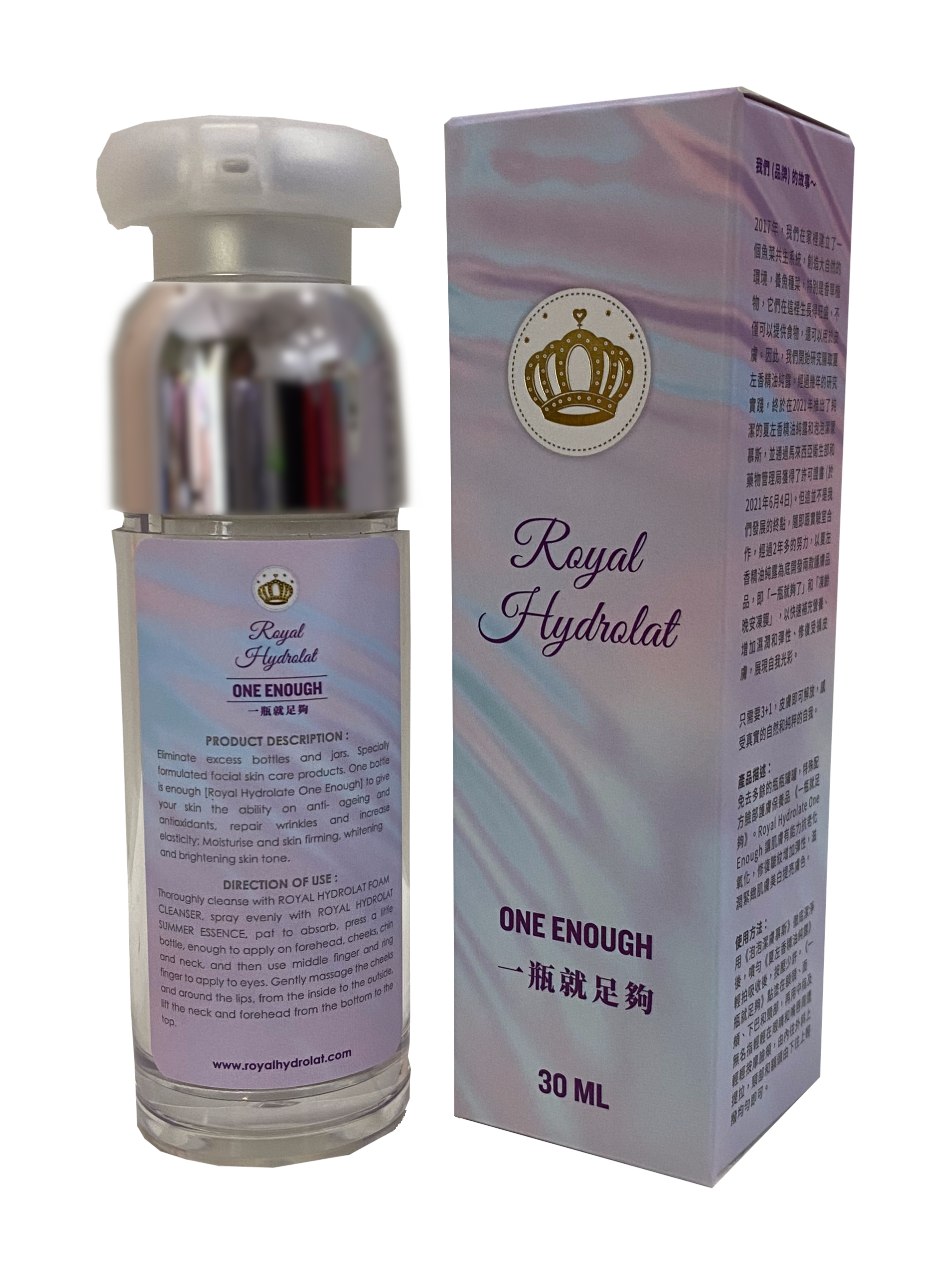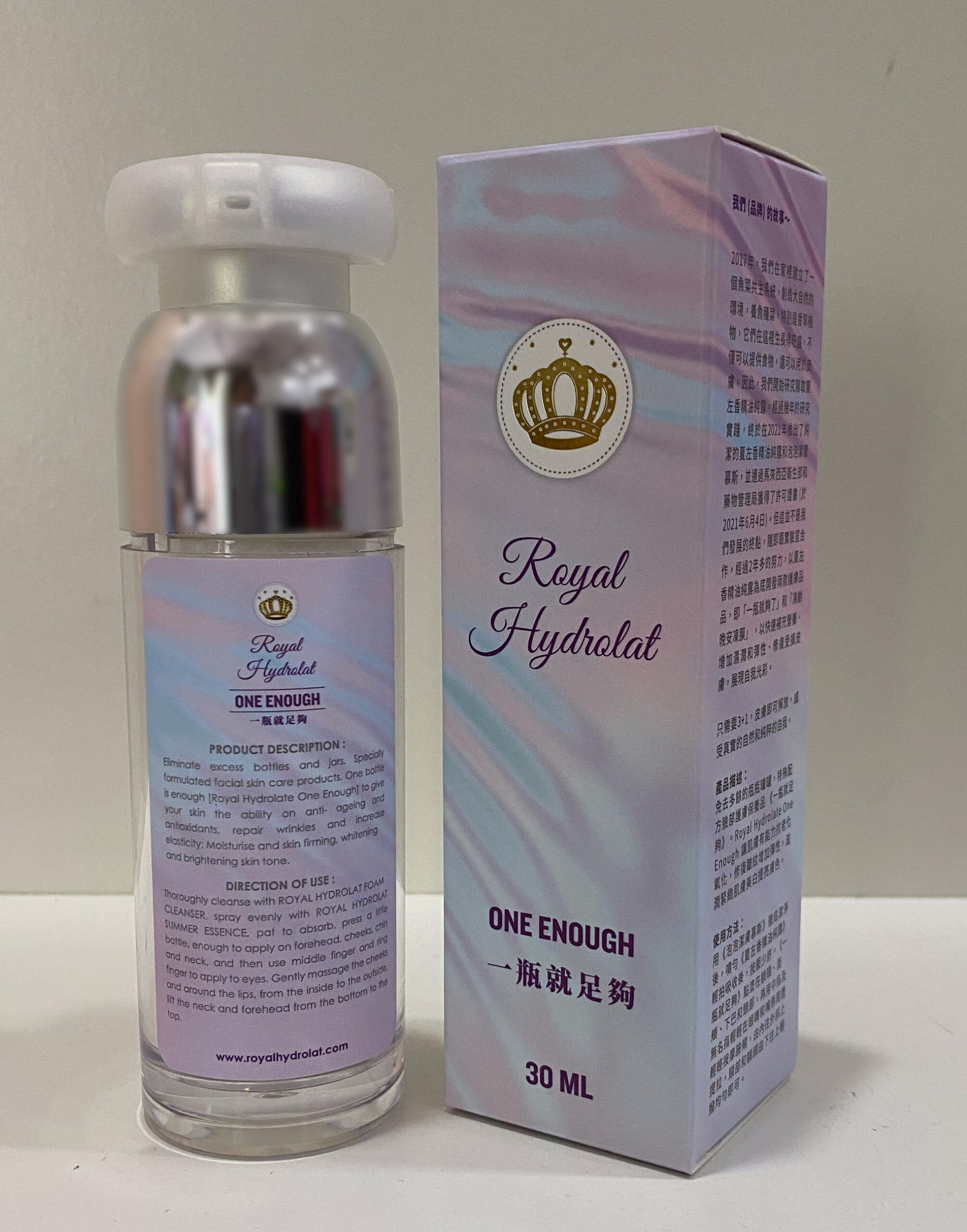 免去多餘的瓶瓶罐罐,特殊配方 臉部護膚保養品 一瓶就足夠,Royal Hydrolat One Enough 讓肌膚有能力抗老化、抗氧化、修復皺紋、增加彈性 滋潤緊緻肌膚和美白提亮膚色。